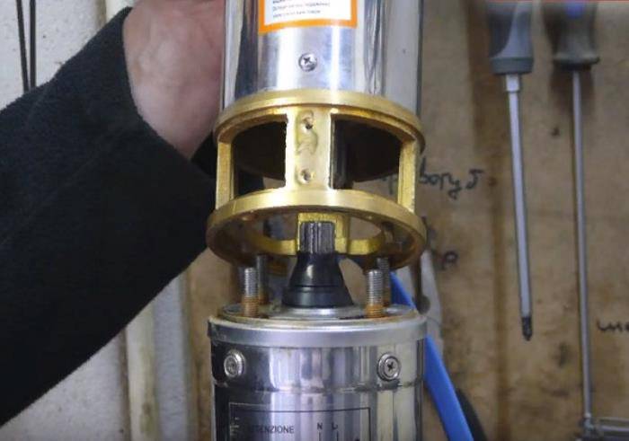 - Après avoir dévissé les fixations, séparez la partie pompage de l'appareil du moteur. A ce stade, il est possible de déterminer dans quelle section le brouillage s'est produit. Si l'arbre du compartiment de la pompe ne tourne pas, cet ensemble doit être démonté.