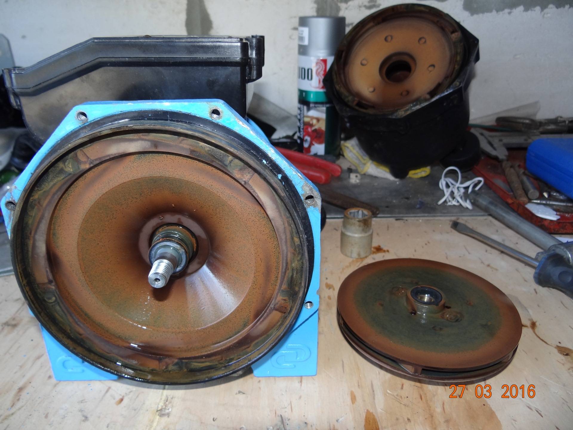 Quatrième problème : la pompe ne tourne pas lorsqu'elle est allumée. Ceci est facilité par un condensateur défaillant, ou une roue "collée" au corps de pompe.Dans une telle situation, pour démarrer la roue bloquée, il suffit de la faire défiler plusieurs fois à la main. Avec un condensateur cassé, la seule issue est de le remplacer.