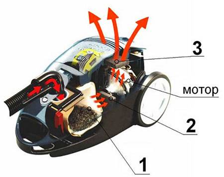La base de l'appareil de tout aspirateur est une pompe à air (ou ventilateur).Le moteur est équipé d'une roue à aubes qui, en tournant, absorbe le flux d'air avec ses pales et, après compression, le libère brusquement vers l'extérieur. Les lignes sont situées dans le boîtier, ainsi qu'au début et à la fin de la pompe à air. Les lignes d'aspiration fonctionnent à basse pression, tandis que les lignes de pression fonctionnent à haute pression. L'air circule dans le carter, qui est évacué pendant le fonctionnement du moteur. Avec le flux d'air, les particules de poussière sont aspirées dans le tuyau à l'aide d'une buse et tombent dans le bac à poussière. Là, la poussière se dépose et l'air rejette ses petites particules. Afin d'empêcher les plus petites particules de poussière de s'échapper, les modèles modernes d'aspirateurs sont équipés de filtres.