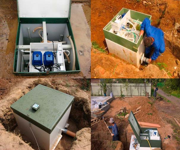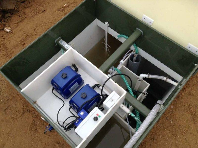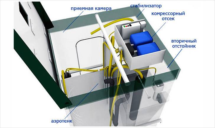 La saturation de la masse de déchets en oxygène oxydant est assurée par deux compresseurs installés à l'intérieur de l'appareil. Il y a aussi des ponts aériens, des filtres, etc. Les stations de pompage forcé des effluents sont équipées d'une ou plusieurs pompes pour stimuler le mouvement de la masse traitée.