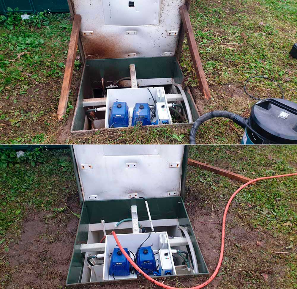 Avec l'unité éteinte, retirez le tuyau de la pompe mamut du clip de fixation et faites-le sortir de la station, retirez le bouchon en desserrant le collier métallique à l'extrémité du tuyau. Nous allumons l'installation en phase directe (l'interrupteur à flotteur dans la chambre de réception est relevé de force). Après avoir pompé environ 50% du volume (environ 1 mètre de colonne de liquide) de la chambre dans un récipient préalablement préparé, nous éteignons l'installation. nous fixons le bouchon et fixons le tuyau dans sa position d'origine.