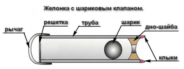 Le moyen le plus simple et le plus simple d'enlever un bouchon de sable est de le gélifier. L'écope est un tuyau en acier d'une longueur de 1 à 3 mètres avec un diamètre quelque peu inférieur à la circonférence du tuyau de prise d'eau. De la poudre à pâte pointue et un clapet anti-retour sont montés dans la partie inférieure de l'écope.