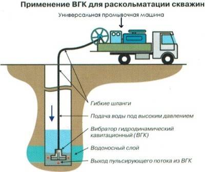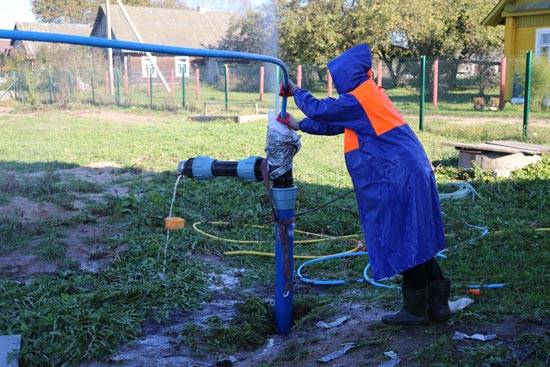 À l'aide d'une pompe profonde, l'eau contaminée est pompée dans le réservoir en passant à travers un filtre. La pompe de surface prend l'eau purifiée du réservoir et la pompe à nouveau dans le puits. Le seau est périodiquement débarrassé du sable et du limon. La procédure est effectuée jusqu'à ce que de l'eau propre sans impuretés s'écoule du puits.