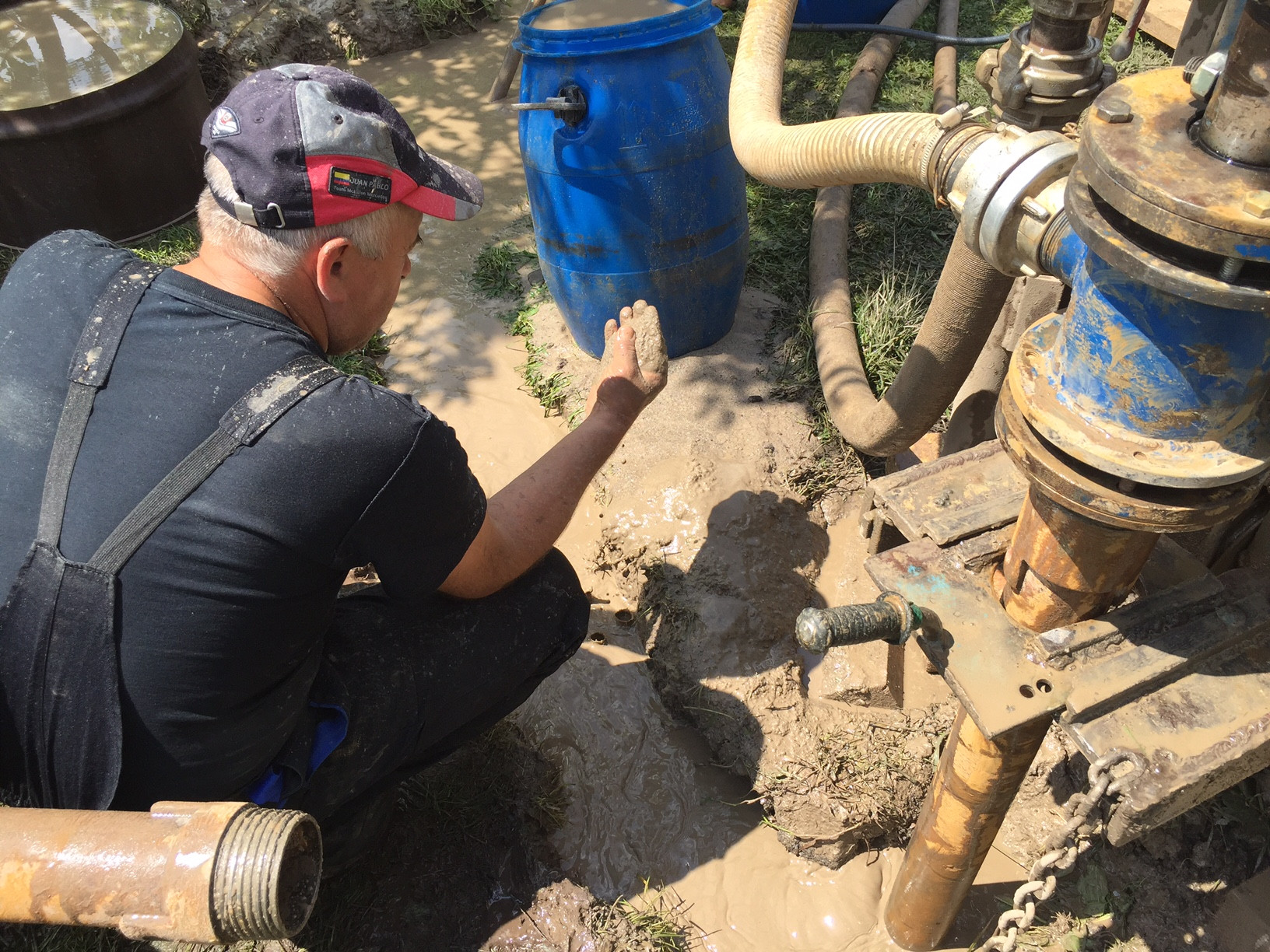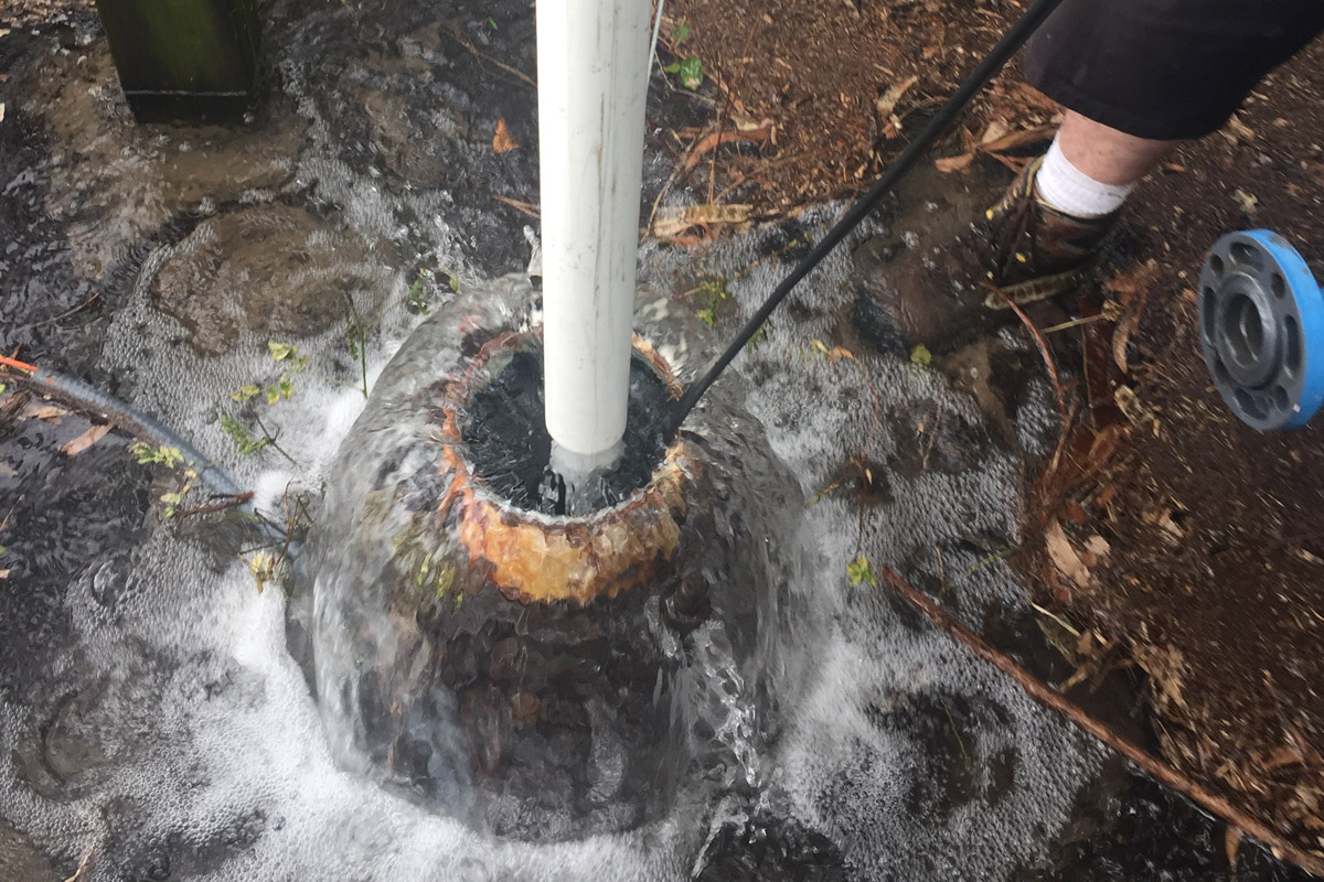 La pompe est allumée pour pomper l'eau, et elle soulève le limon et le sable du filtre. Le puits de forage déborde rapidement d'eau et commence à jaillir de manière incontrôlable. Les particules de pollution sont rejetées avec de l'eau.