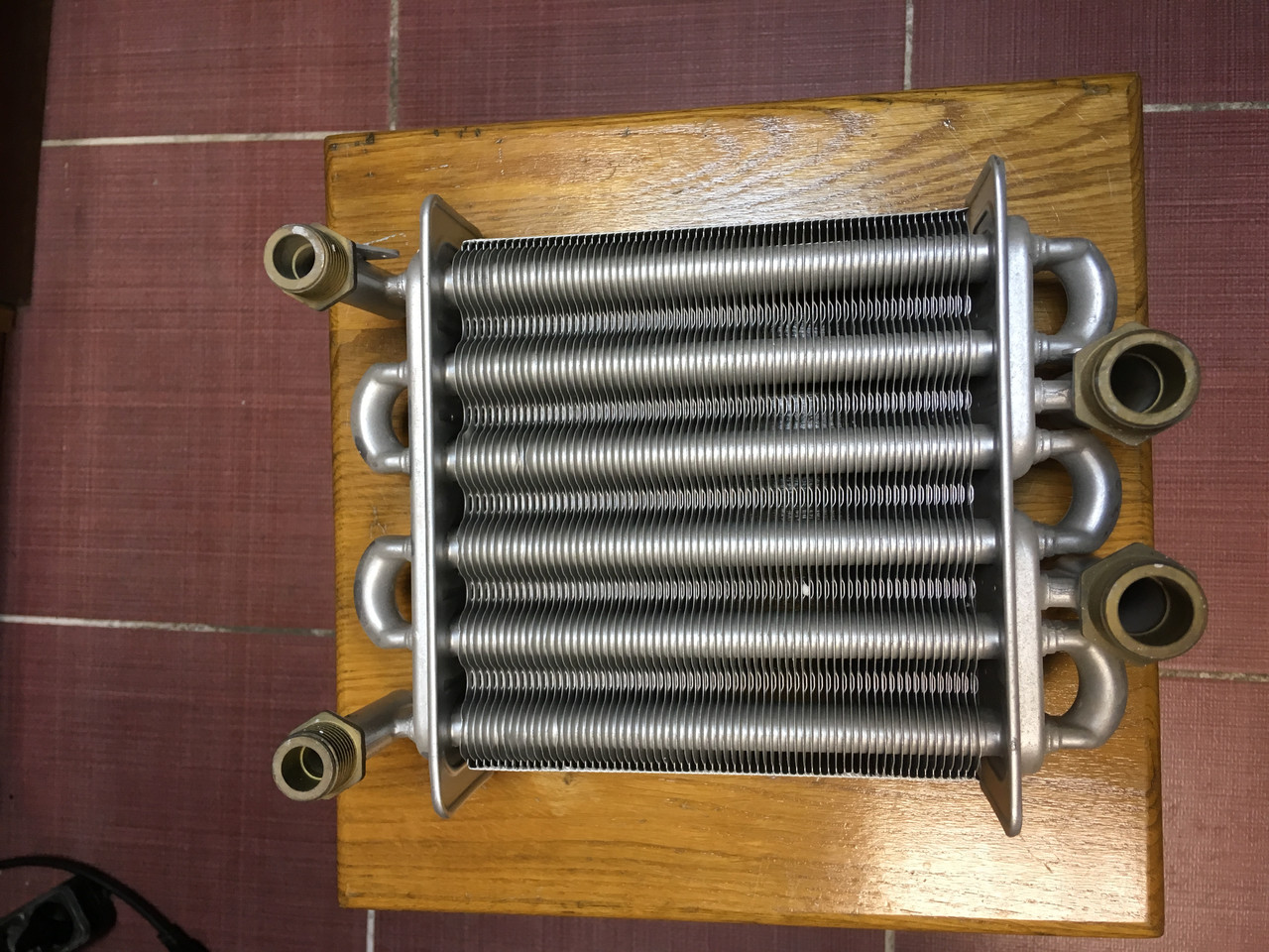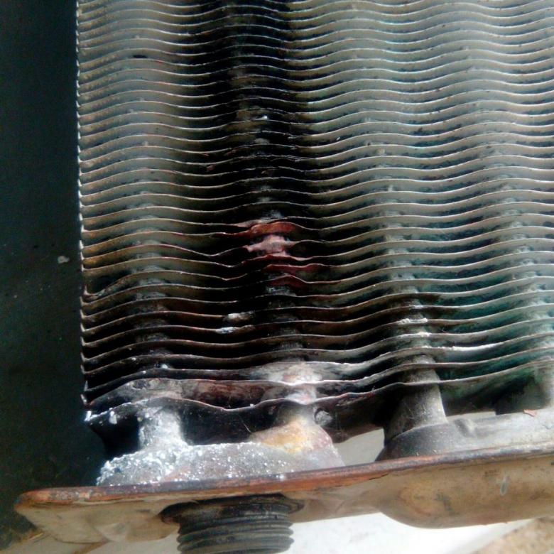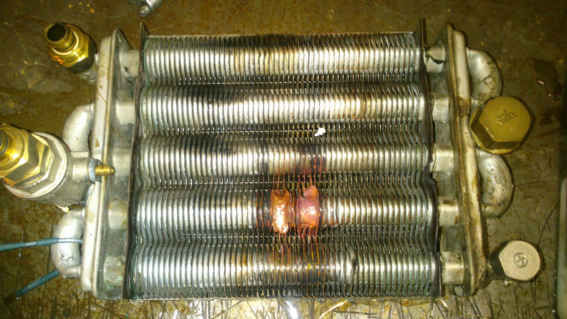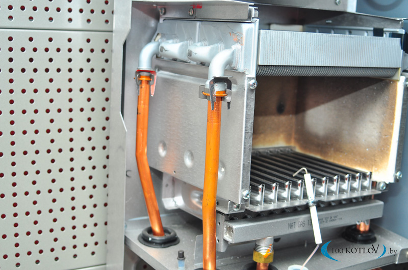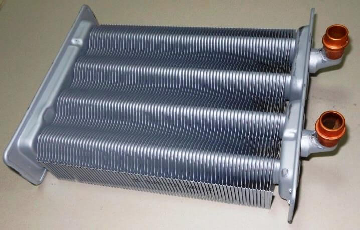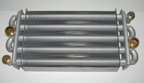 Échangeur de chaleur bithermique d'une chaudière à gaz à double circuit. Sur le côté droit des tuyaux pour chauffer l'eau. A gauche - tuyaux pour l'eau sanitaire Un détartrage régulier à l'intérieur et de la suie à l'extérieur est nécessaire.