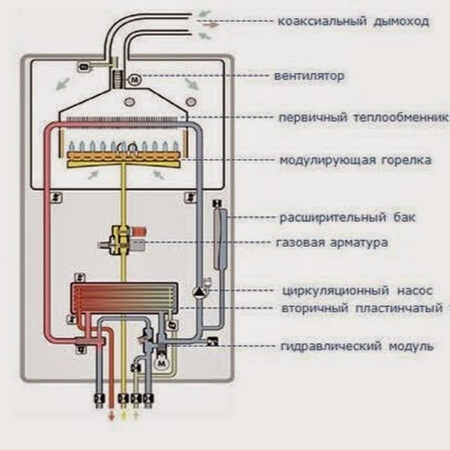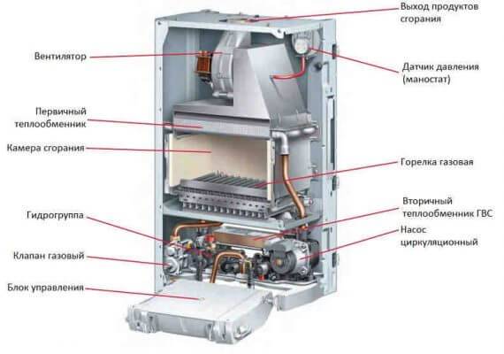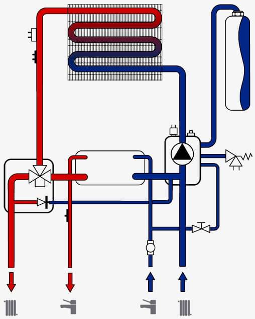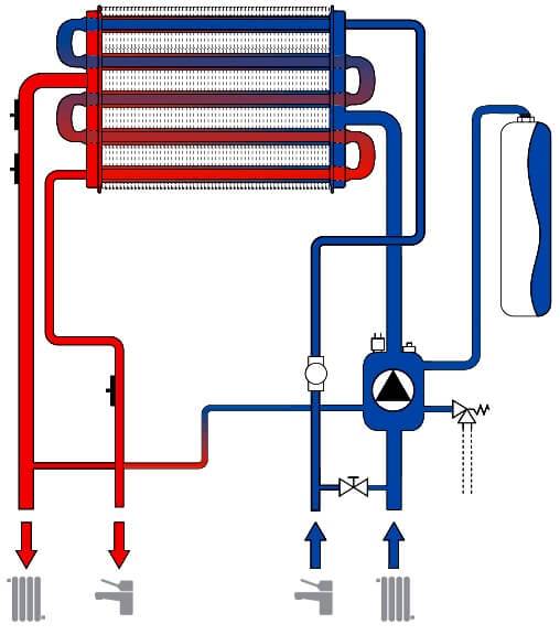Circuit double le plus souvent des chaudières à gaz ont deux échangeurs de chaleur.L'un est primaire, dans lequel l'eau est chauffée par du gaz pour le chauffage. L'autre est l'échangeur de chaleur ECS secondaire, dans lequel l'eau de chauffage de l'échangeur de chaleur primaire chauffe l'eau de la canalisation ECS.