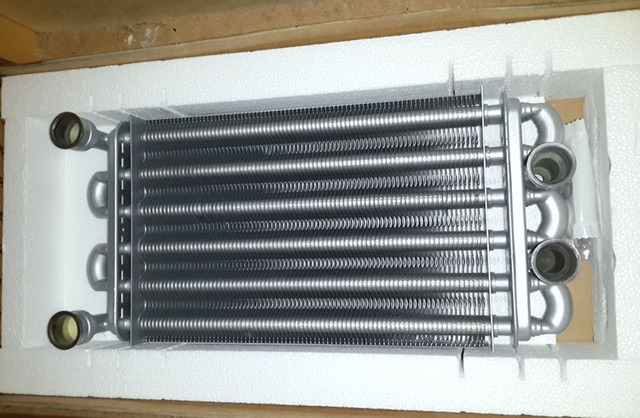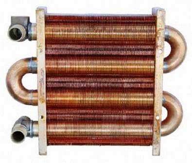Bien que les échangeurs de chaleur de différents systèmes de chauffage puissent présenter certaines caractéristiques distinctives, leur conception et leur principe de fonctionnement sont fondamentalement les mêmes: un liquide de refroidissement traverse un tuyau incurvé (serpentin), puis le serpentin se réchauffe avec une flamme de gaz brûlant, transférant de la chaleur au liquide qui le traverse, fourni plus loin le long des tuyaux aux radiateurs de chauffage. Le système de plaques, dans lequel se trouve le tube chauffé par la flamme, permet d'augmenter la température et de rendre le chauffage du matériau de la bobine plus uniforme. Extérieurement, un tel système ressemble à un radiateur installé dans une voiture.