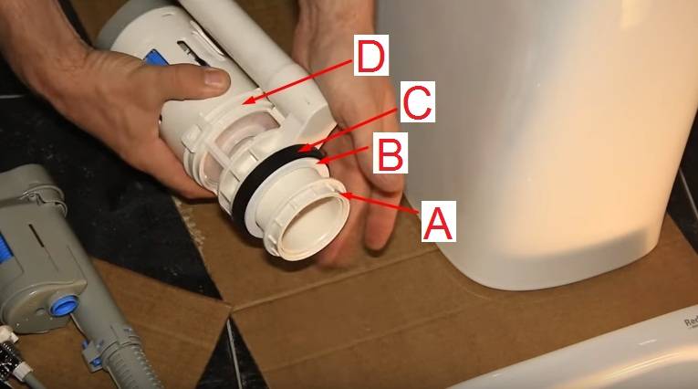 - Vanne de vidange. Il fournit de l'eau à la cuvette des toilettes lorsque vous appuyez sur le bouton ou que vous soulevez la tige. La vanne est fixée hermétiquement dans le trou et à l'état normal ne permet pas de fuite.