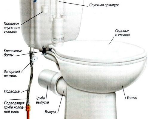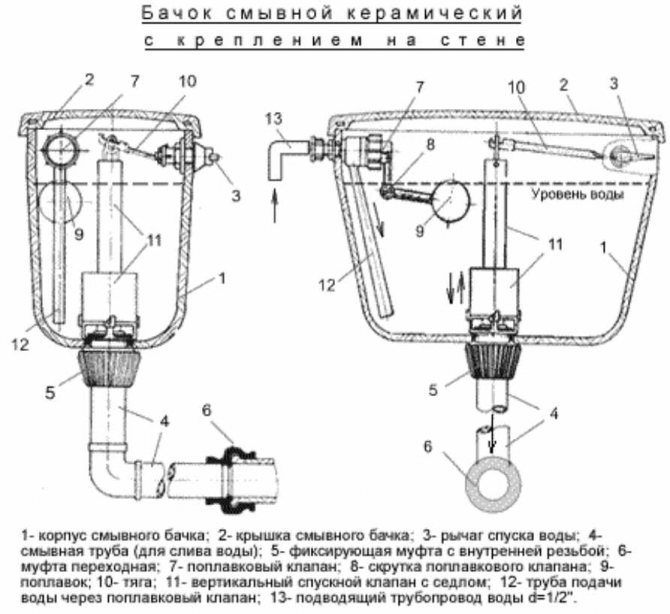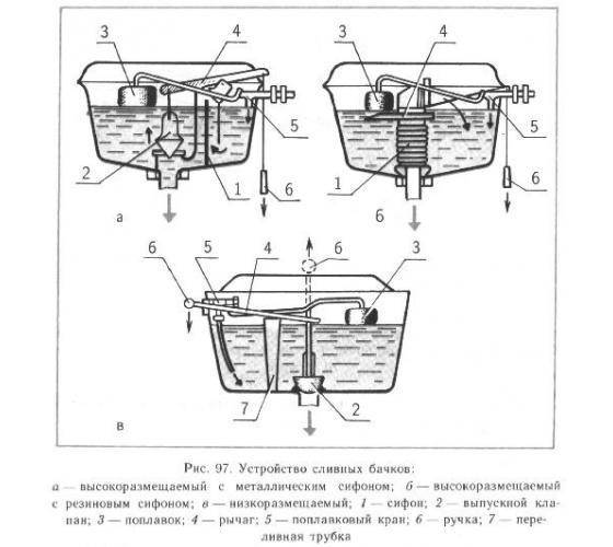 Les plus courants sont le mécanisme à bouton-poussoir et à tige pour évacuer l'eau, cette dernière option étant plus courante dans les anciennes cuvettes de toilettes de l'ère soviétique. Dans tous les cas, l'eau remplit le réservoir jusqu'au niveau requis, puis son écoulement est arrêté par une vanne d'arrêt à l'aide d'un mécanisme à flotteur. Le dispositif de tout réservoir de vidange comprend les composants suivants :
