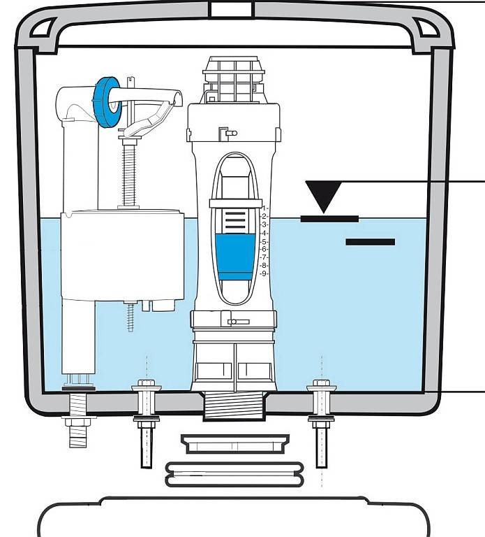 Le volume d'une chasse d'eau complète est réglé à l'aide d'un flotteur - sa position sur la tige par rapport au tube de trop-plein assure le niveau d'eau dans le réservoir entièrement rempli. La recommandation standard est que la coupure de l'alimentation doit se produire lorsque la nappe phréatique est à 15-20 mm sous le bord du trop-plein :