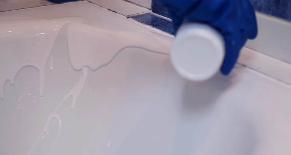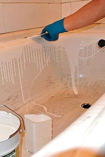 Considérons maintenant la chose la plus importante - comment couvrir le bain acrylique à la maison. Pour commencer, il faut y verser de l'eau très chaude pour qu'elle se réchauffe. L'application doit être effectuée en versant progressivement le mélange sur tout le périmètre et en le répartissant uniformément avec une spatule. L'excédent peut être retiré par le trou de vidange.