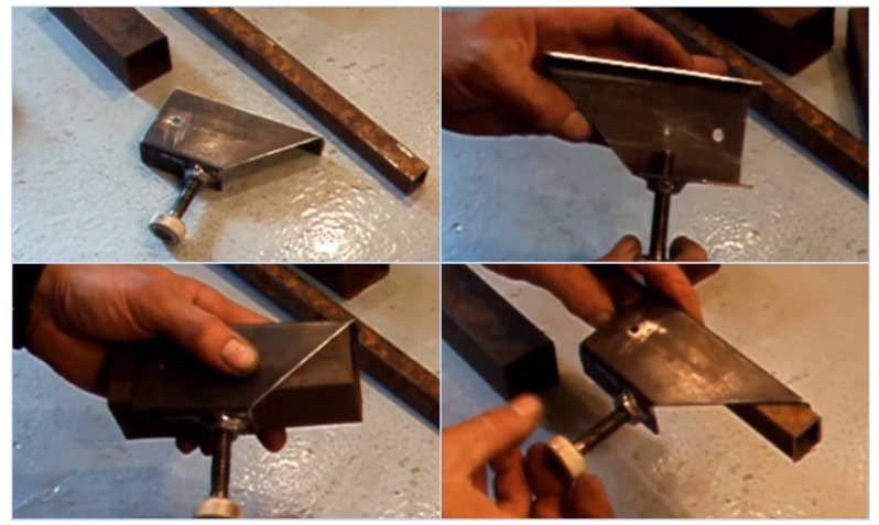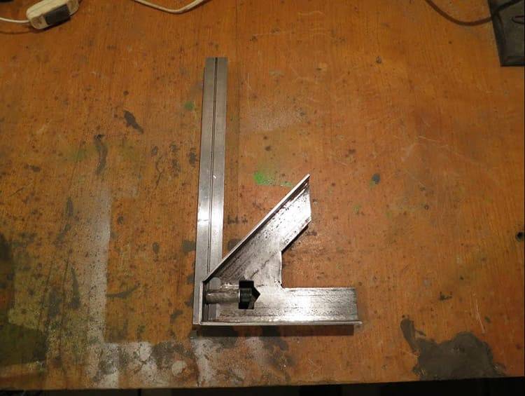 Pour ce faire, utilisez le gabarit précédemment fabriqué, sur le côté duquel un trou est percé et un écrou est soudé. Lors du travail, une boîte à onglets faite maison est placée sur le profil, un boulon est vissé dans son écrou et l'appareil est pressé contre la surface du profil. Une meuleuse avec un disque pour les coupes de métal, appuyant légèrement le disque contre la surface latérale de l'appareil. Il est clair que lors d'un travail prolongé, les bords de la boîte à onglets se meulent progressivement, et bien que le processus se produise simultanément sur tous les bords, certaines erreurs apparaîtront au fil du temps. Par conséquent, il est préférable que l'appareil soit fabriqué en métal dur résistant à l'usure afin d'augmenter sa durée de vie et d'obtenir un outil plus précis.