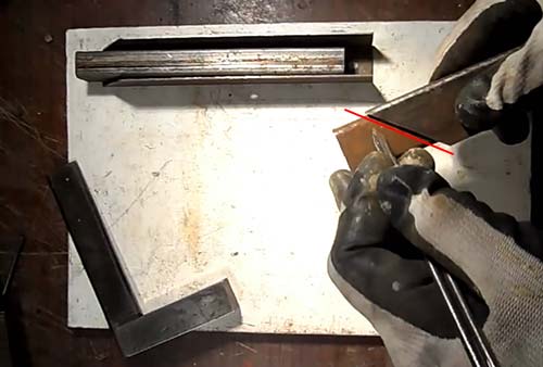 S'il y a un carré à portée de main, vous devez d'abord déterminer la ligne exacte de l'extrémité du tuyau, y compris celle du profil. En appliquant l'outil et en le déplaçant doucement sur la surface, nous obtenons une ligne de coupe de 45 degrés. La même technique est utilisée avec un carré à 30 degrés.