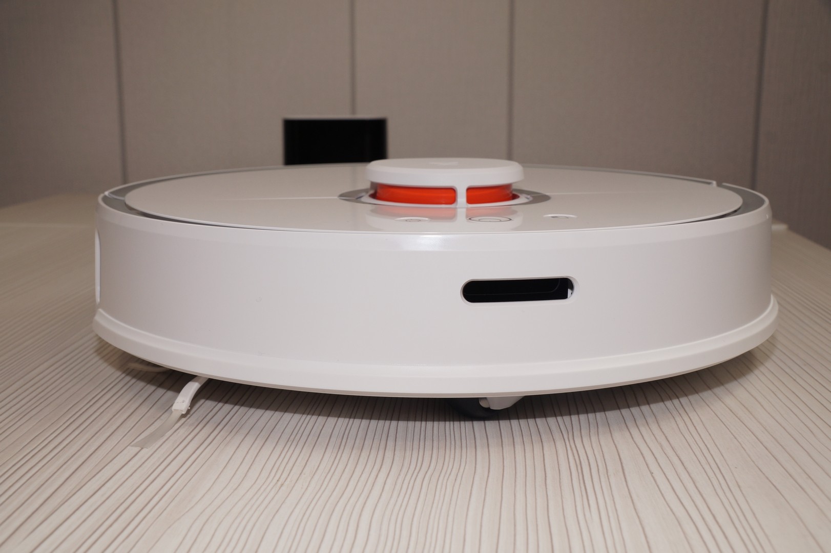 Un capteur de distance laser convexe (télémètre) est situé sur le dessus du boîtier, ce qui permet à l'appareil d'analyser la pièce où la surface est nettoyée, de construire sa carte et également de choisir le schéma de mouvement optimal. Ici, dans la partie supérieure, on retrouve deux boutons mécaniques principaux pour commander l'aspirateur robot : le bouton « power » et le bouton « home ».