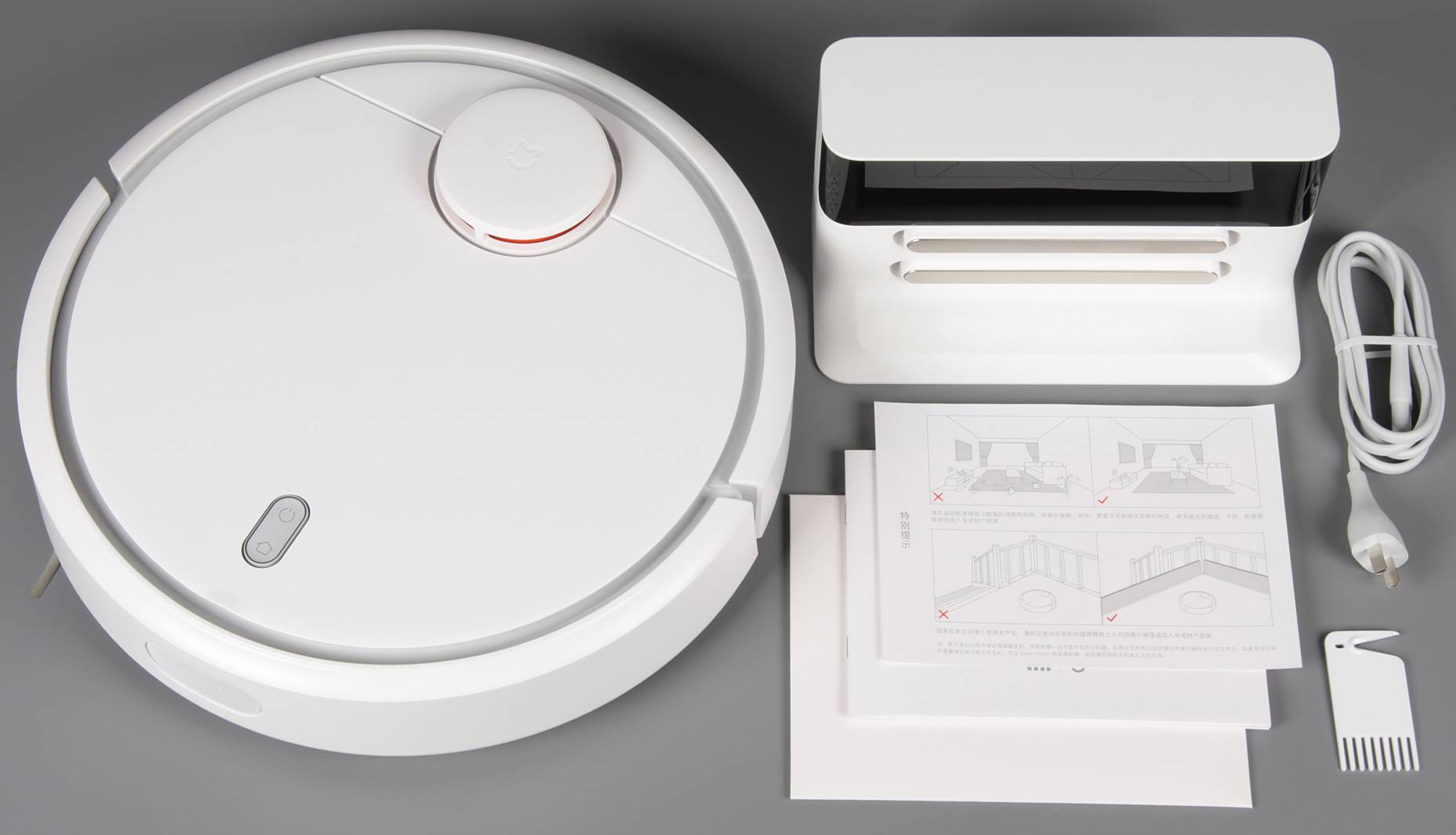 L'ensemble complet du robot Xiaomi n'est pas très différent, le même "pauvre". Parmi les accessoires contenus dans la boîte, vous trouverez une base de chargement, un câble d'alimentation, des instructions, une carte de garantie et une brosse pour nettoyer la brosse. Séparément, vous pouvez acheter une bande magnétique pour restreindre les mouvements. Comme nous pouvons le constater, les différences de configuration sont minimes, mais il convient de noter que la garantie de cet aspirateur robot est de 1 an et non de 2.