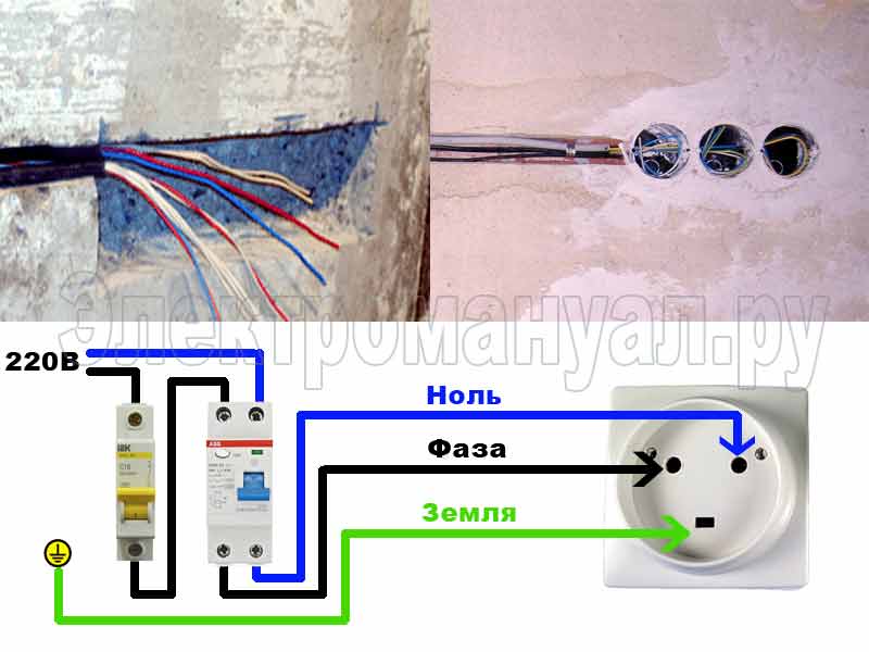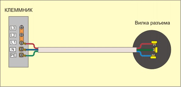 Un câble à trois conducteurs est sélectionné: 1 conducteur - fil de phase café, gris ou noir, 2 - zéro bleu ou bleu, 3 - terre jaune-vert.