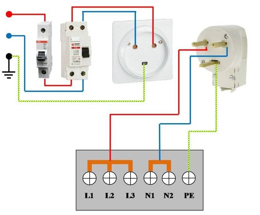 Initialement, la mise à la terre est effectuée sur la borne «PE», et après zéro sur «N». S'il y a plusieurs fils, un cavalier est utilisé pour connecter les fils entre eux et un fil bleu est connecté à l'un des fils.