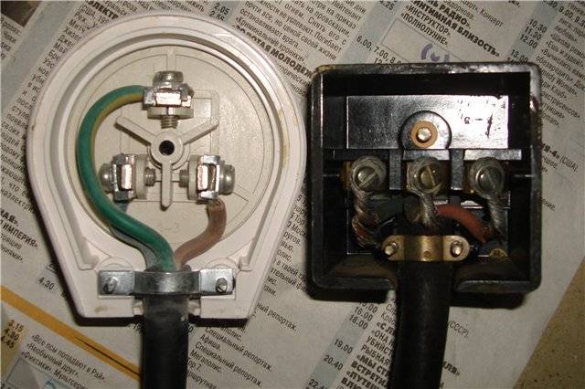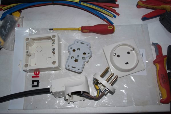 Dans ce cas, il est très important de connecter correctement tous les fils. Le fil jaune-vert doit être connecté au contact de mise à la terre de la prise, qui est situé au centre, et les fils de phase et neutre sont connectés aux contacts extrêmes