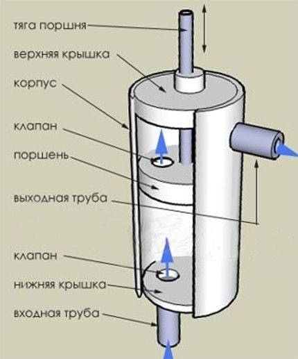 Traditionnellement, cet appareil se trouve sur les sites. Il fait face efficacement à la tâche d'extraire du liquide de faibles profondeurs jusqu'à 7-8 m.Il est basé sur un piston de travail se déplaçant le long du cylindre.