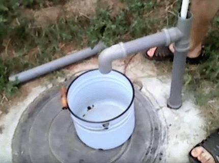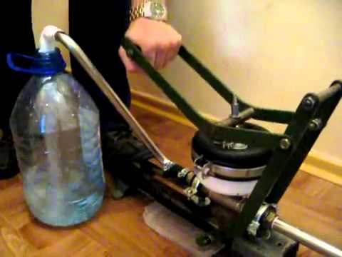 L'unité fabriquée est attachée et testée en action. Une telle pompe artisanale pompe parfaitement l'eau à une profondeur de deux mètres. Il durera plusieurs années pour un fonctionnement fiable, compte tenu de son fonctionnement cyclique.
