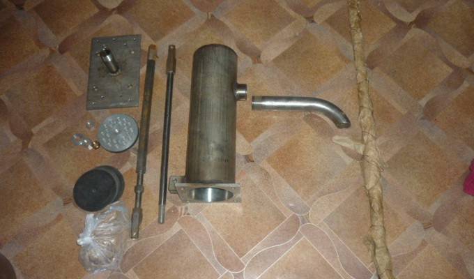 Pour sa fabrication, vous pouvez utiliser du métal ou du plastique. Dans le couvercle, assurez-vous de faire un trou pour la tige. Lorsque la conception est prête, le piston est placé à l'intérieur. Après cela, le fond est fermé avec exactement le même couvercle avec une valve. Un tuyau d'alimentation en eau est soudé sur le côté.