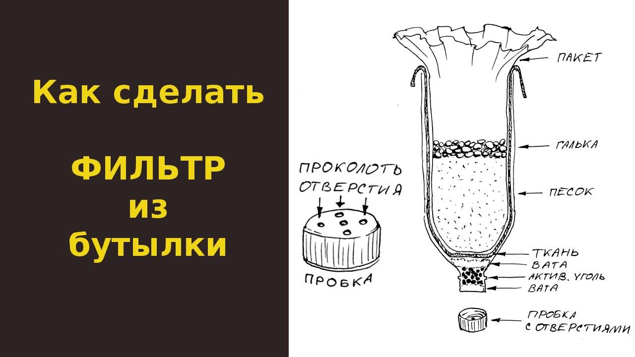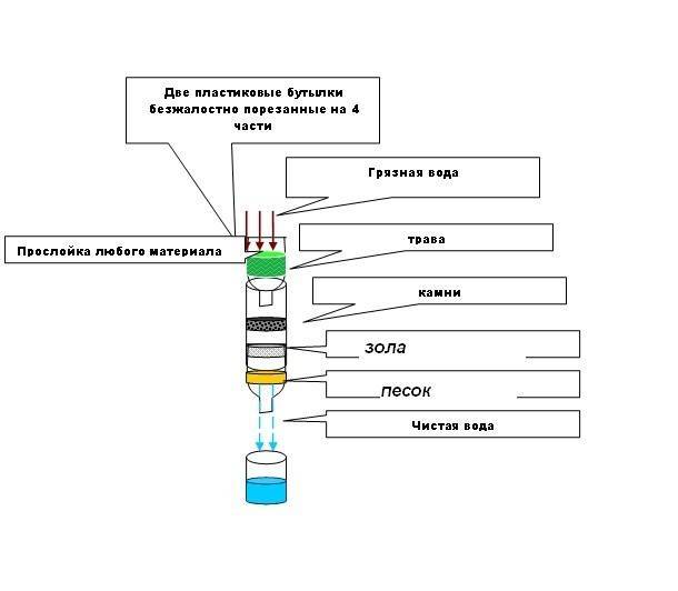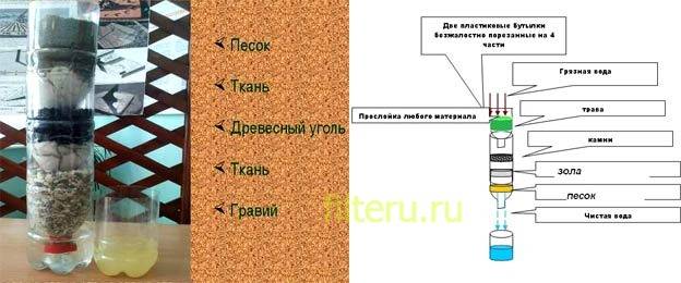 Lors d'un long voyage, il n'est pas très pratique de transporter de lourdes bouteilles d'eau potable. Il serait plus sage d'emporter quelques appareils avec soi et de faire un filtre à l'arrêt. De la maison, vous devrez prendre deux bouteilles en plastique, gaze ou tissu synthétique.