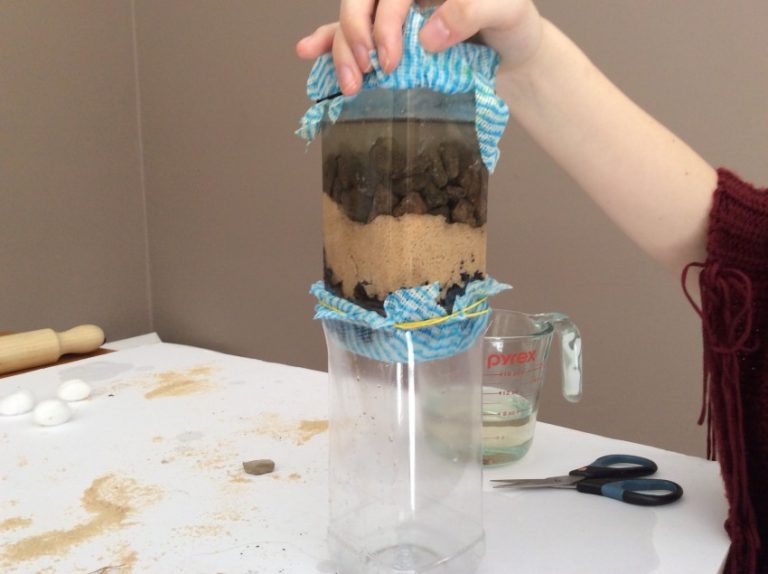 - Dans une bouteille sans fond, mettez en séquence : gaze, charbon, sable.