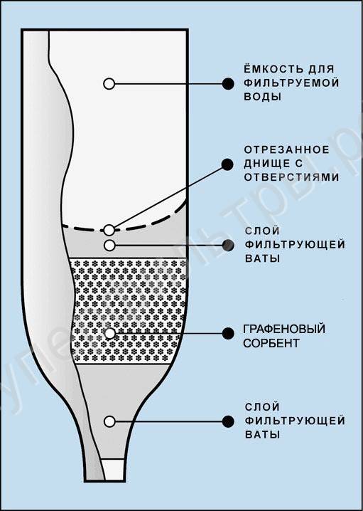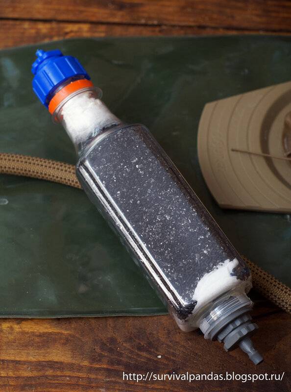 Dans les appareils faits maison, le charbon actif est le plus largement utilisé. Il retient également qualitativement les formations minérales et les substances toxiques. Un autre avantage est que l'eau après l'avoir traversée devient transparente, les odeurs désagréables et les micro-organismes sont éliminés.