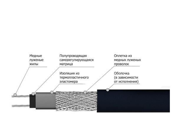Ce système câble chauffant autorégulant pour conduites d'eau complètement différent dans son principe de la première option. Deux conducteurs (métal) sont séparés par une matrice semi-conductrice spéciale, qui agit comme une source de chauffage. Cela garantit une conductivité de courant élevée à basse température. Dans le même temps, lorsque la température augmente, la consommation d'électricité diminue nettement.