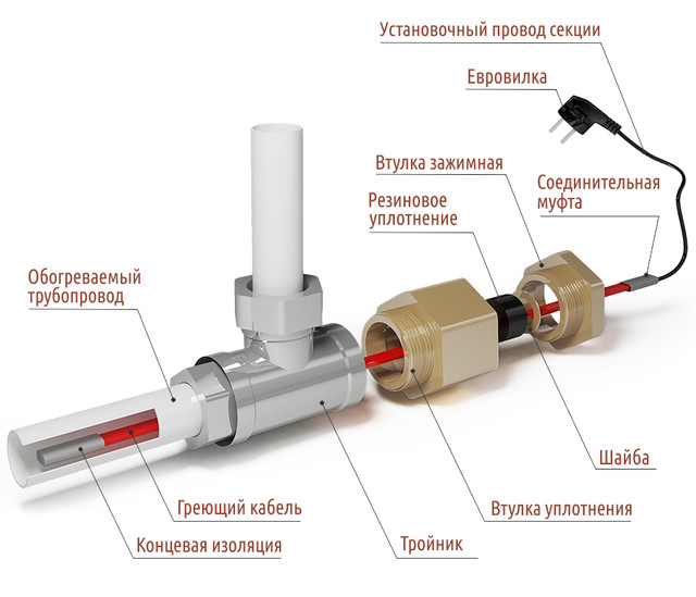 Les câbles résistifs à deux conducteurs sont utilisés pour les systèmes de plomberie aussi activement que les samregs. Ils peuvent être montés à l'intérieur des tuyaux à l'aide de tés et de joints.