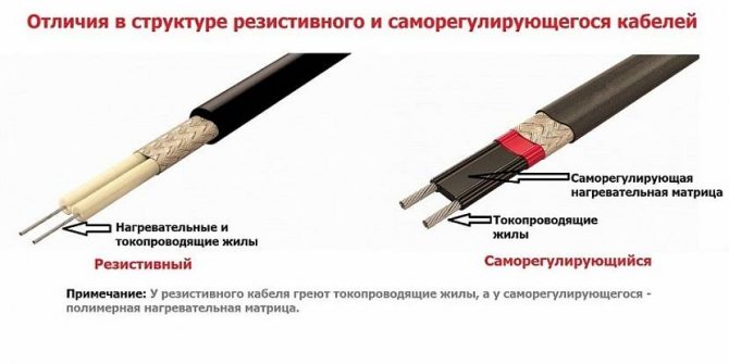 • Par type - le câble peut être autorégulateur ou résistif. Dans le même temps, le principe de fonctionnement des deux appareils de chauffage est le même. Le chauffage se produit en raison du courant qui traverse les veines internes;