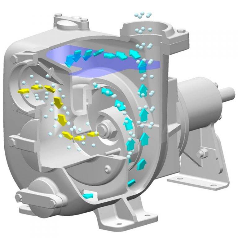 L'air, représenté en jaune sur la figure, est aspiré dans le corps de pompe par la dépression créée par la rotation de la roue (impulseur). Ensuite, l'air qui est entré dans la pompe est mélangé au fluide de travail contenu dans le boîtier de l'unité. Sur la figure, ce liquide est représenté en bleu.