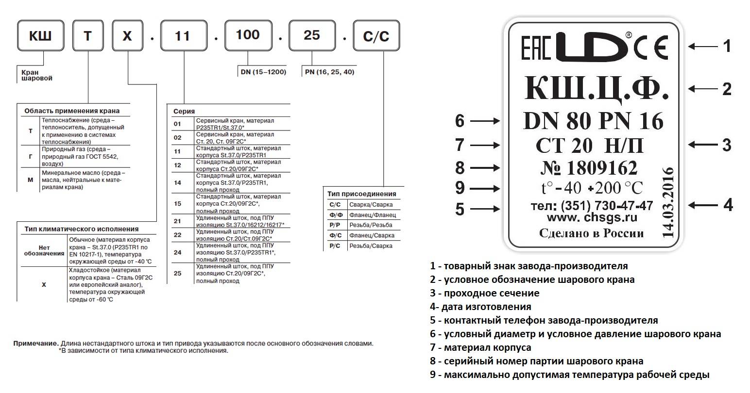 Chaque fabricant a sa propre gamme de vannes fabriquées, mais tous les produits fabriqués en Russie, ainsi que les appareils importés vendus dans la Fédération de Russie, sont conformes à GOST 52760. Cette norme réglemente le marquage des équipements d'arrêt et de contrôle, qui comprend des vannes à bille .