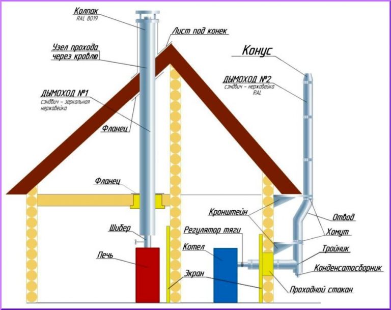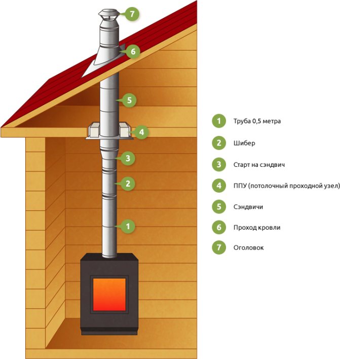 Nous notons également que même avec deux couches, de telles cheminées nécessitent une bonne isolation des sections les plus résistantes au feu - nous parlons du toit, des poutres et des planchers. De plus, le sandwich ne doit pas être utilisé pour se connecter directement au radiateur.