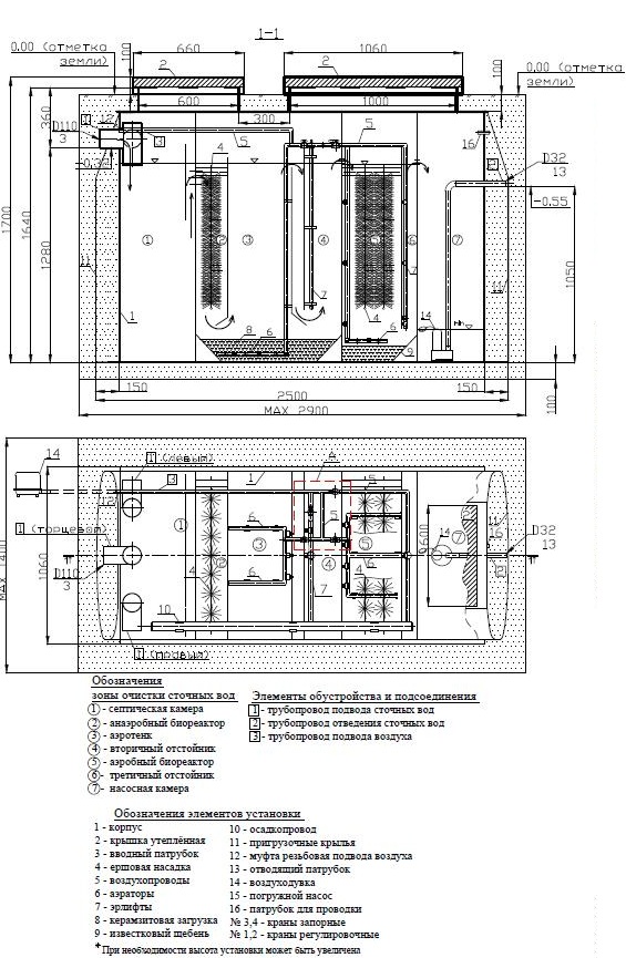 Les deux bassins de décantation sont reliés l'un à l'autre par un pont aérien, à l'aide duquel les boues activées sont pompées. De plus, les deux bassins de décantation, l'aérotank et le bioréacteur aérobie sont équipés d'un système de ventilation soutenu par un groupe compresseur.Deux couvercles sont fournis sur le dessus, qui sont nécessaires pour l'inspection visuelle des sections technologiques de la fosse septique, ainsi que pour faciliter l'accès lors de l'entretien.