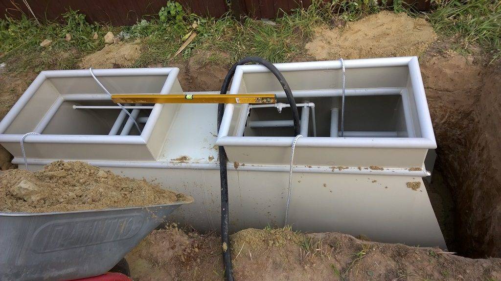 Le fond de la fosse excavée est recouvert de mortier ciment-sable, la fosse septique est installée et fixée. Après cela, les tuyaux d'égout et l'électricité sont connectés.
