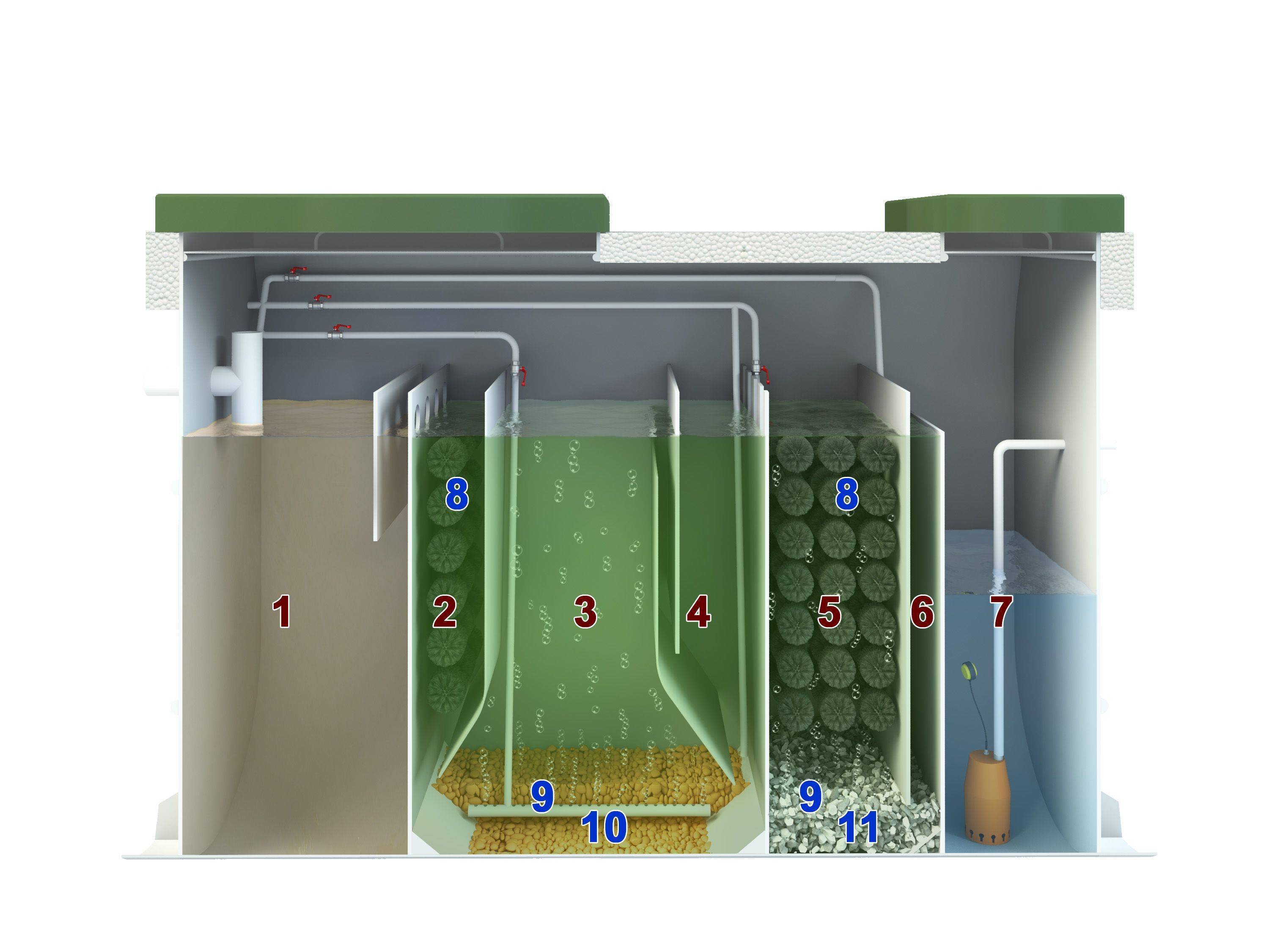 - pourcentage élevé de traitement des eaux usées (de 95 à 98%), de ce fait, il n'est pas nécessaire de filtrer le sol. L'eau purifiée peut être drainée dans un réservoir, un sol ou utilisée pour l'irrigation, sans que vous ne soyez dérangé par une odeur désagréable.