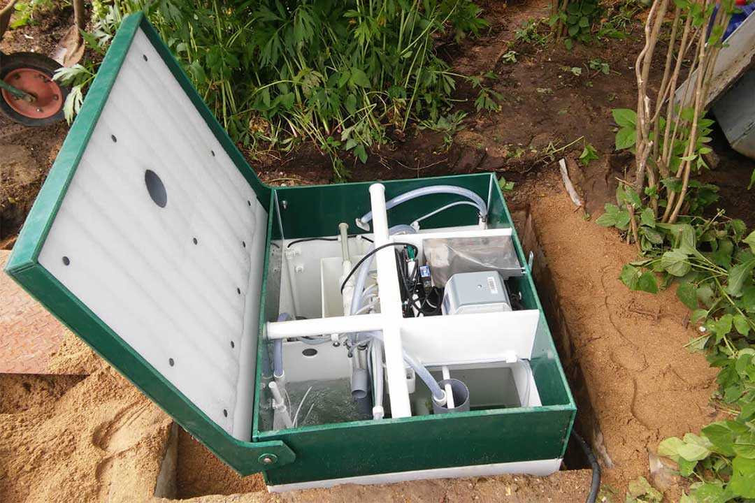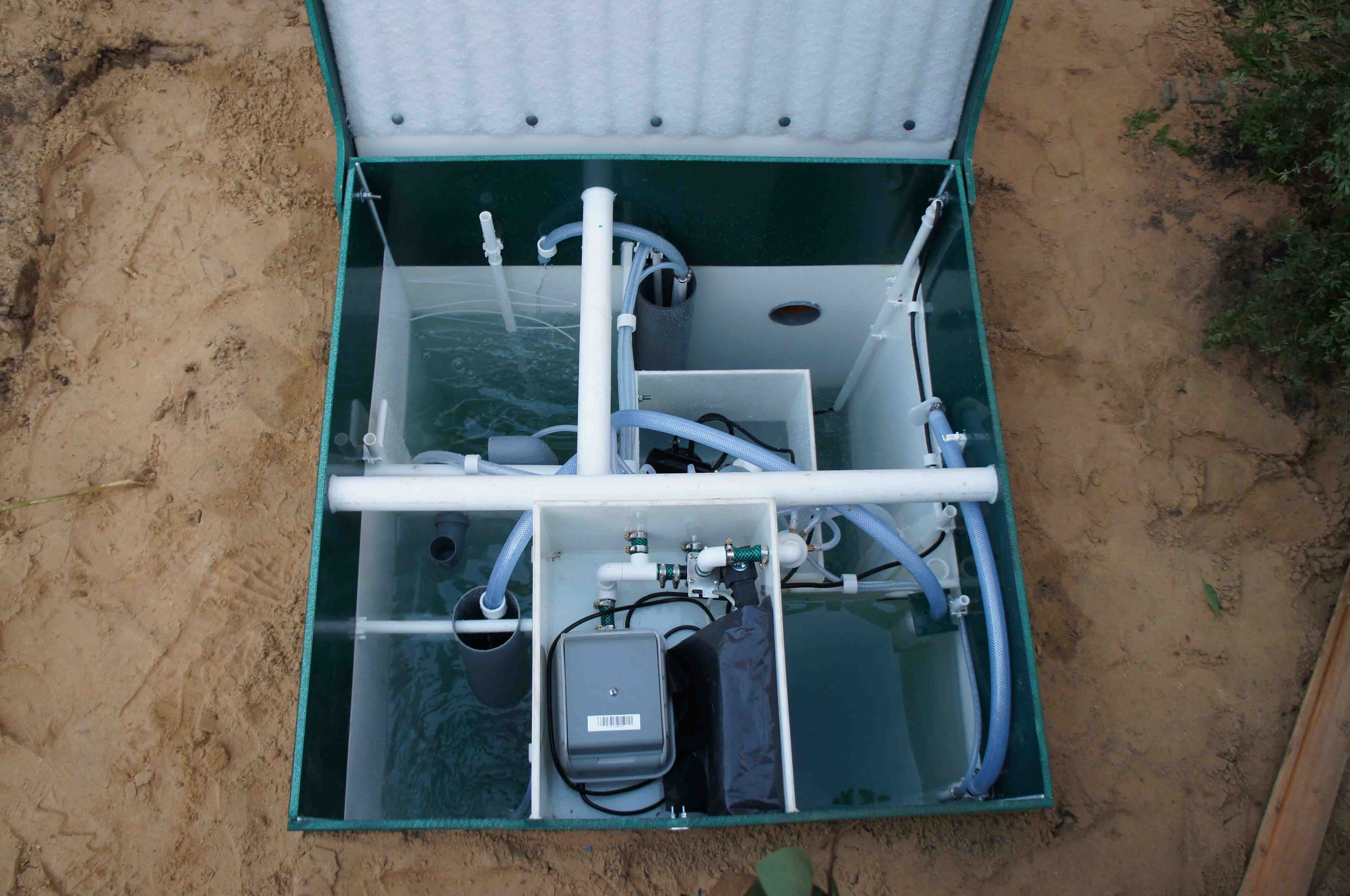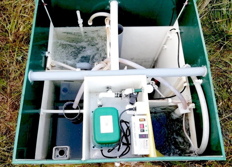 L'électricité est utilisée pour alimenter la fosse septique. L'équipement lui-même comprend une pompe, des tuyaux et des tubes, un piège à graisse et à cheveux, des filtres, un circulateur et un recirculateur.