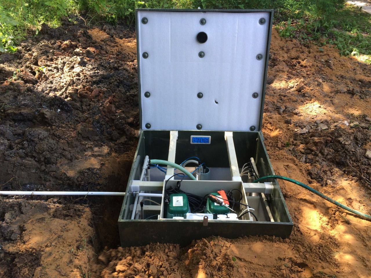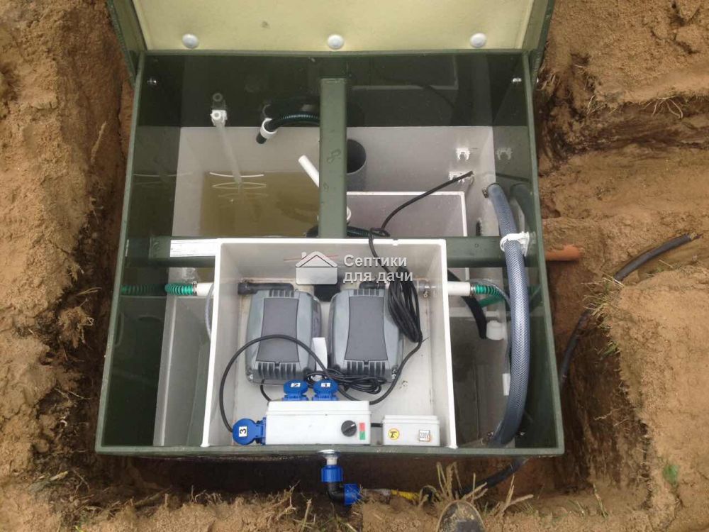 Tout d'abord, l'eau contaminée pénètre dans le 1er compartiment, où se trouve un filtre pour les grandes fractions. Tout est défendu ici.L'effluent est ensuite pompé dans le deuxième compartiment, où sont prélevées des bactéries aérobies, transformant les déchets en boues activées.