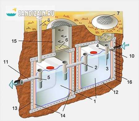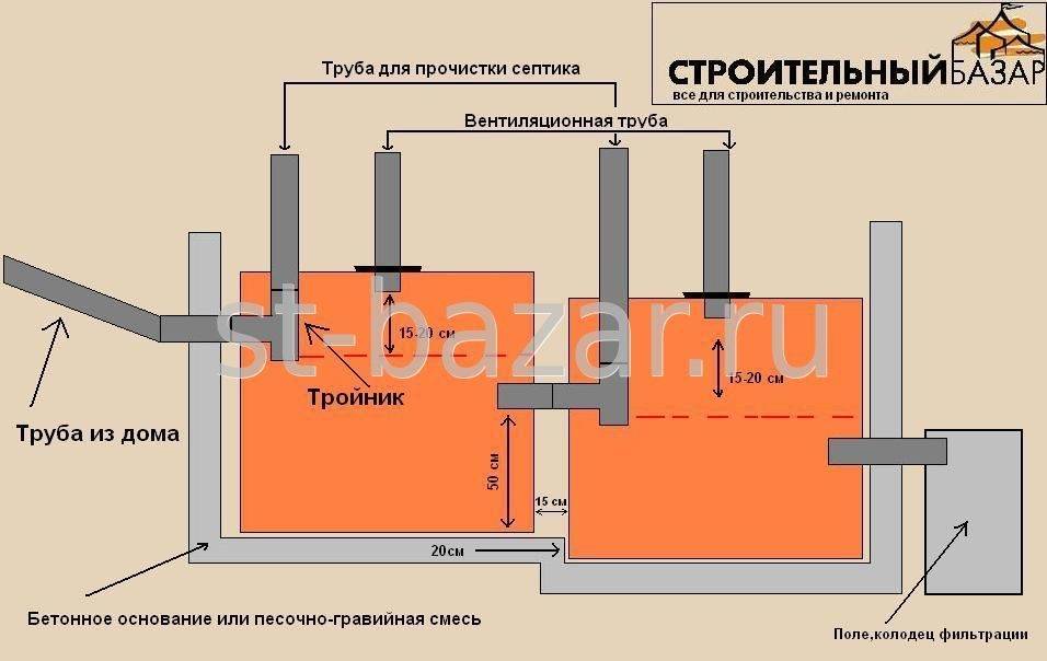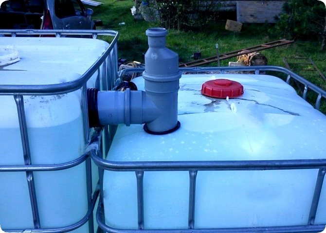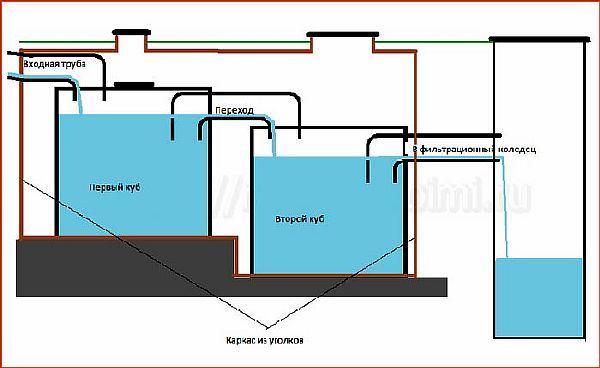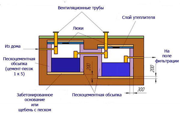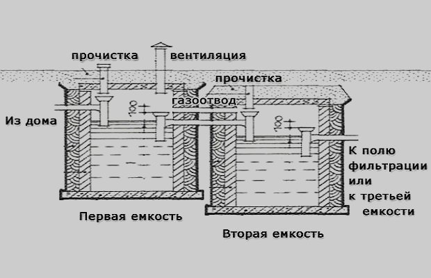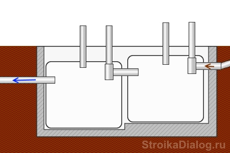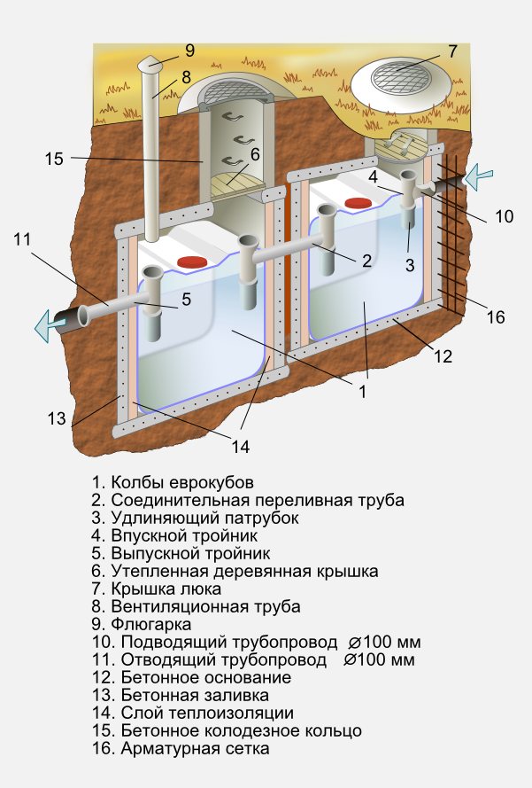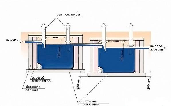 Le plus souvent, les propriétaires collectent fosse septique de deux eurocubesassez pour servir une famille ordinaire. Le dispositif à deux chambres fonctionne comme suit :