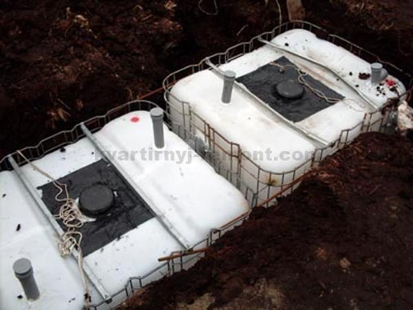 Une fois la structure immergée dans la fosse, les parois de la fosse septique et de la canalisation sont isolées avec de la mousse plastique. Une solution de béton est également coulée entre les parois des conteneurs et le sol. Cette procédure peut être omise si le sol n'est pas sujet à l'excrétion, à l'érosion. Maintenant, de l'eau est versée dans le réservoir et la structure est recouverte de sable.