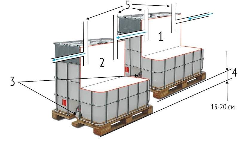 Les Eurocubes doivent être situés à différents niveaux, c'est-à-dire chacun sera inférieur au précédent, puis les drains s'écouleront d'un eurocube à l'autre.