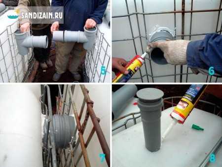 - Insérez un tuyau de dérivation dans le trou, fixez-y un té à l'intérieur de l'eurocube, scellez la connexion du tuyau de dérivation avec la paroi du corps avec du mastic.