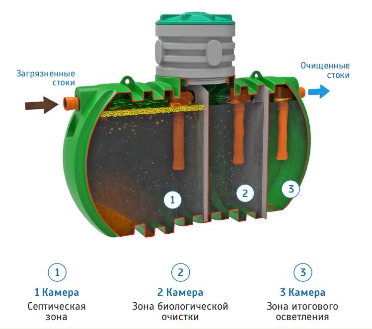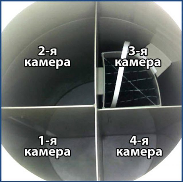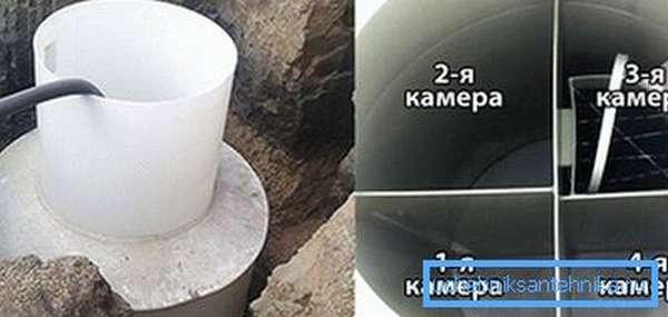 Les quatre chambres de la fosse septique sont complètement autonomes et fonctionnent indépendamment les unes des autres, le liquide, s'écoulant d'un oedème à l'autre, est soumis à un niveau de purification plus élevé