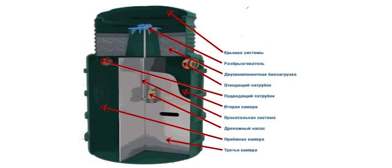 Au fond du troisième compartiment se trouve un aérateur (un dispositif sous la forme d'un tuyau perforé à travers lequel l'oxygène est pompé dans la chambre par un compresseur). Avec son aide, les effluents sont oxydés, ils sont encore clarifiés et partiellement absorbés par les bactéries. Des colonies de micro-organismes vivent dans le gravier, qui est éparpillé au fond du compartiment.