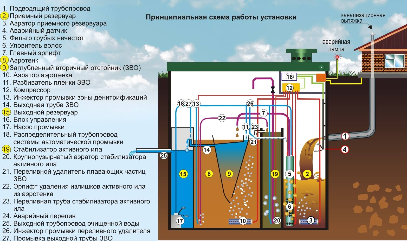 - Le quatrième compartiment est un décanteur secondaire - un lien intermédiaire entre le premier aéroréservoir et le deuxième aéroréservoir. La fonction de transit est son objectif principal. Pendant que l'eau sale coule d'une section à l'autre, des suspensions lourdes se précipitent partout, les boues sont évacuées de chaque section vers la première chambre par un système de tuyaux spéciaux.