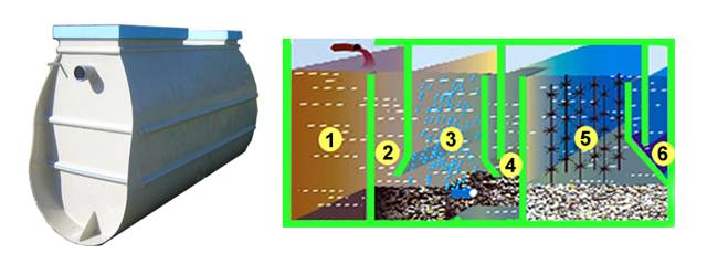 - Du cinquième compartiment, l'eau s'écoule dans le dernier sixième compartiment. La précipitation finale des boues y est effectuée, elle est introduite par un pont aérien dans la première chambre, l'eau purifiée est évacuée de la fosse septique Leader par gravité dans la fosse d'égout ou de force dans le puits. De là, les effluents traités vont dans le sol.