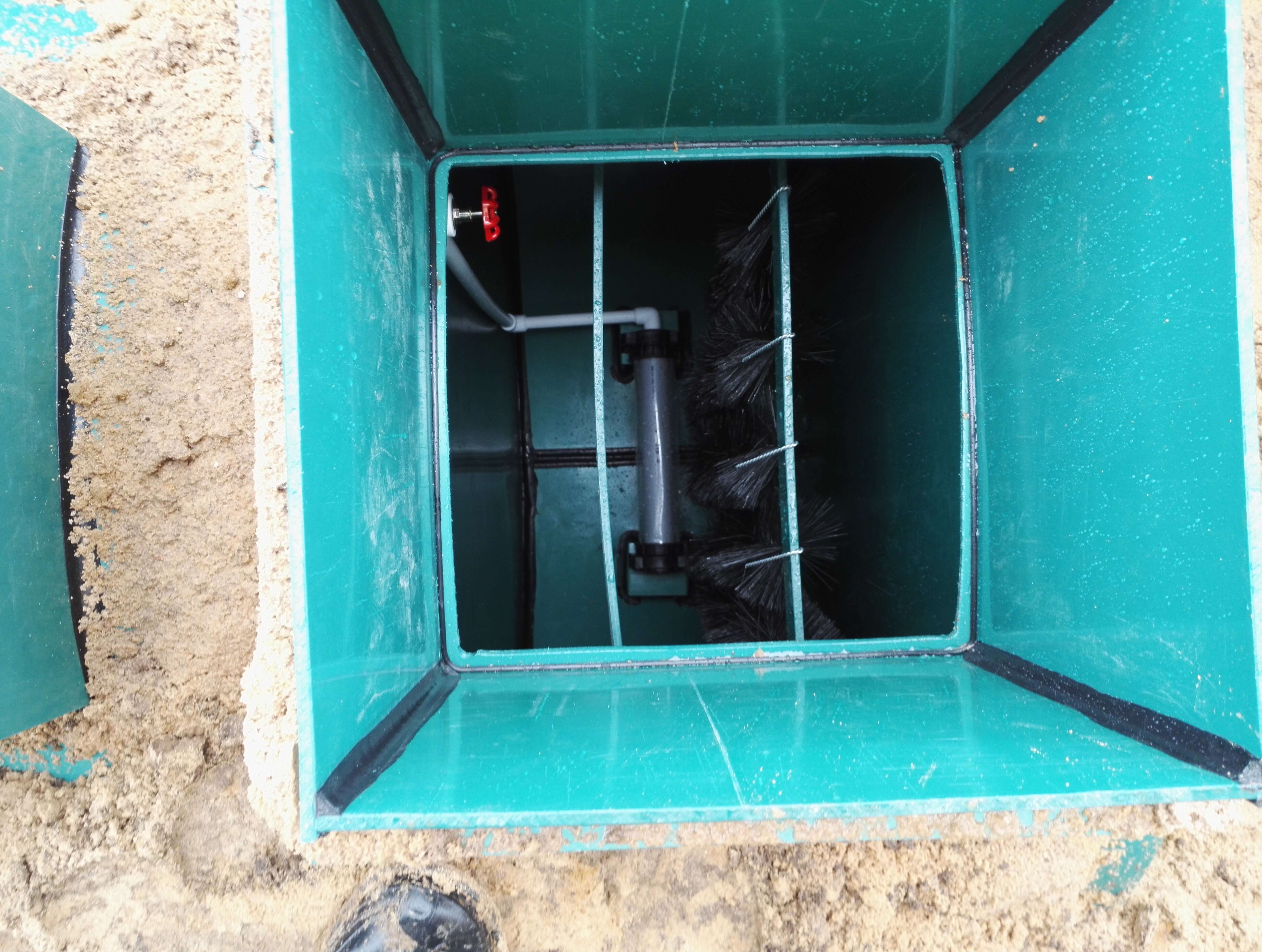 - La première chambre occupe un quart de l'ensemble du boîtier en plastique; elle reçoit les drains sales entrant dans la fosse septique par le tuyau d'égout. Dans celui-ci, le liquide sale se dépose et se divise en particules légères et lourdes. Toutes les grosses matières organiques se déposent doucement au fond, une suspension légère flotte et s'y regroupe, formant une croûte.