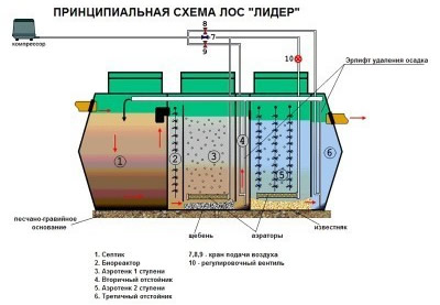 Ils diffèrent par la puissance et la capacité du compresseur. Par exemple, une fosse septique Leader 0,4 convient à une famille de 4 personnes et ne traitera pas plus de 0,4 mètre cube. Eaux usées.