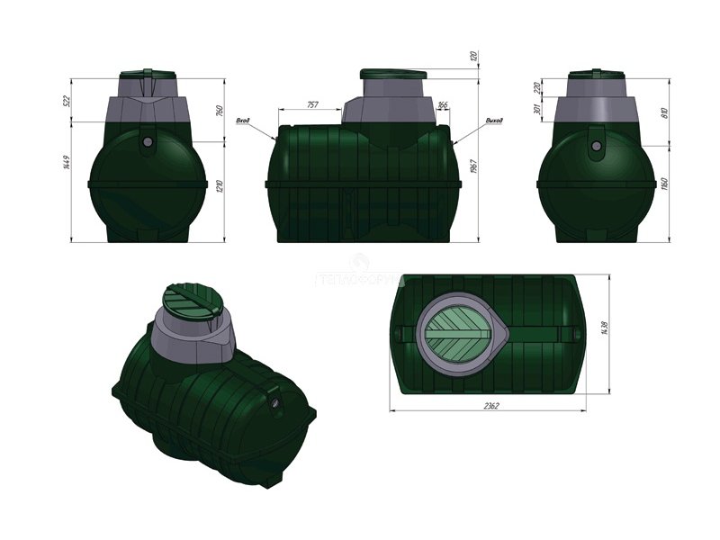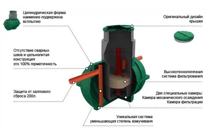 - Conception optimale bien pensée de l'appareil. La capacité de la fosse septique est solide, ce qui lui assure une étanchéité à 100% et l'absence de soudures, sources potentielles de fuites. L'installation est réalisée sous la forme d'un cylindre, cette configuration est la moins sensible au risque de flottement sous l'influence éventuelle des eaux souterraines.